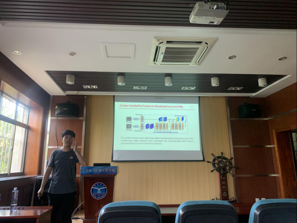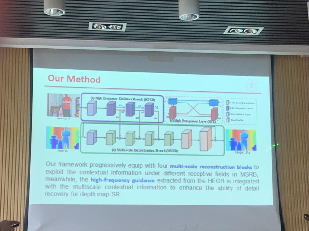 丛教授以“面向深度图的增强与应用”为题,介绍到随着深度成像设备的普及与推广,深度数据发挥着越来越重要的作用,小到智能手机终端,大到无人驾驶系统都有深度数据的作用。此次报告还分享了面向深度数据的超分辨率重建任务和显著性目标检测任务的相关研究成果。最后,参加报告会的师生丛教授进行了深入探讨和交流。