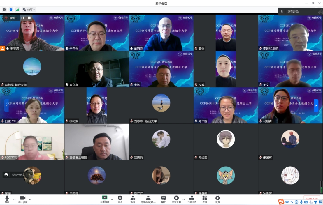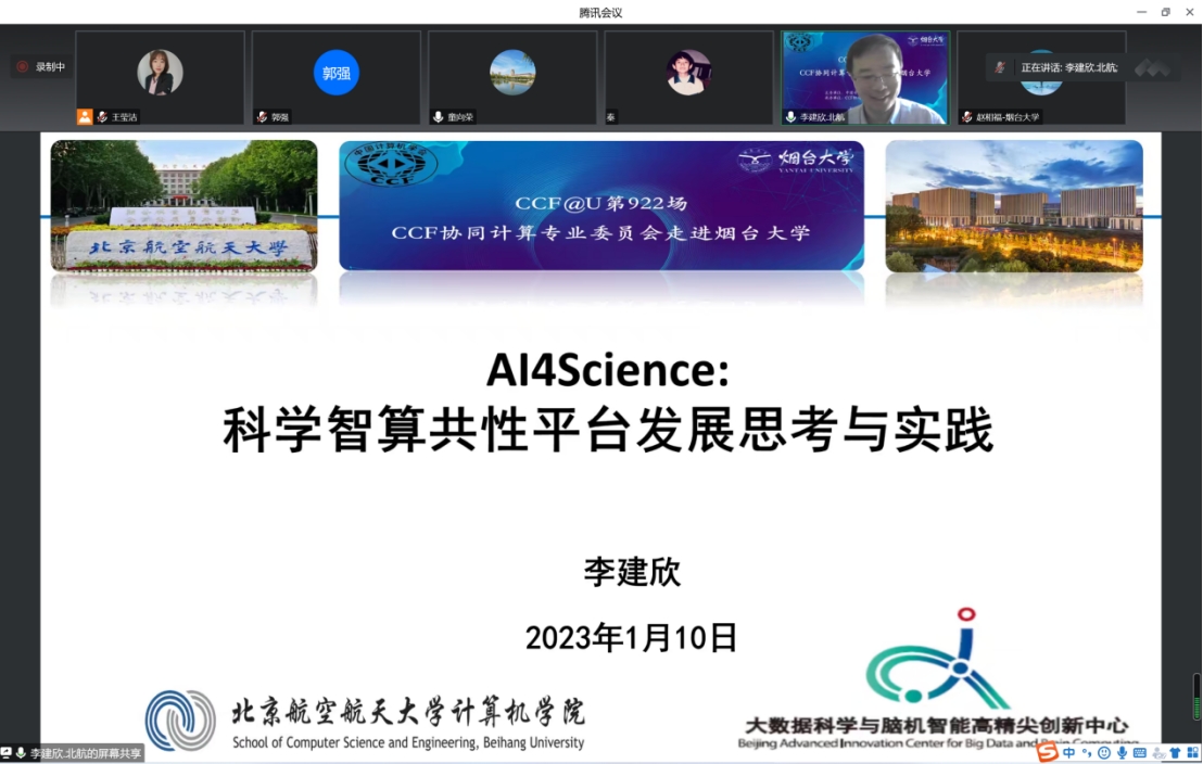 1月10日,由中国计算机学会主办,CCF协同计算专委会和烟台大学共同承办的“CCF@U第922场:CCF协同计算专业委员会走进烟台大学”在线成功举办。北京航空航天大学计算机学院李建欣教授、华南理工大学计算机科学与工程学院陈伟能教授、山东大学软件学院崔立真教授受邀参加,相关专业师生代表200余人齐聚云端。