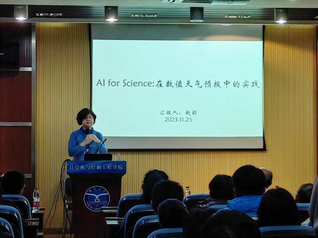 赵颖结合团队研究成果,以数值天气预报领域为例,阐述了AI在科学数值计算领域的发展现状和未来趋势。她在报告中指出,计算挑战性和良好的“数据”基因使得天气预报成为AI for Science的新热点。近期关于快速气象AI模型的研究涌现出一系列优秀的成果,美国英伟达公司、欧洲气象中心和中国气象局都已将基于AI技术的数值天气预报作为重点研究方向。同时,赵颖介绍了清华大学计算机科学与技术系高性能计算研究所近年来开展的AI与数值天气预报深度融合方向的研究,以及相关技术为北京2022冬奥会气象保障任务提供的海量模式数据处理服务等。最后,赵颖与现场师生进行了互动交流,现场气氛热烈,交流深入,师生们表示受益匪浅。