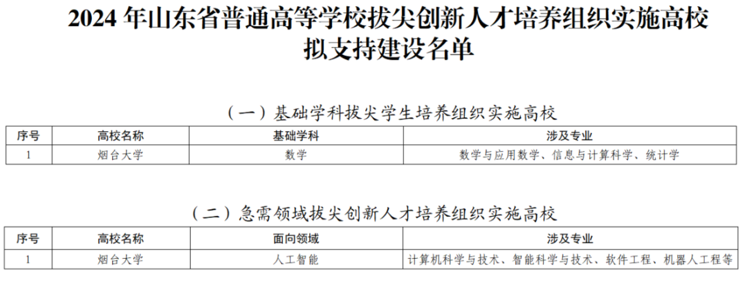 根据《山东省教育厅等5部门关于开展2024年山东省特色学院和拔尖创新人才培养基地建设工作的通知》(鲁教高函(2024) 28号),山东省教育厅高等教育处组织开展了相关学院等遴选评审工作。经高校申报、专家评审等程序,我院获批面向人工智能领域的急需领域拔尖创新人才培养基地,涉及专业包括计算机科学与技术、智能科学与技术、软件工程、机器人工程等。