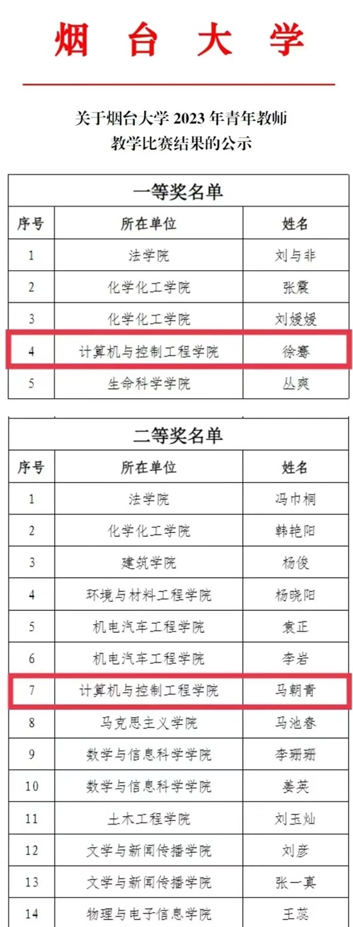 近日,2023年烟台大学“青年教师教学比赛”表彰结果正式公布,我院青年教师徐骞荣获一等奖,马朝青荣获二等奖,祝贺两位老师!
