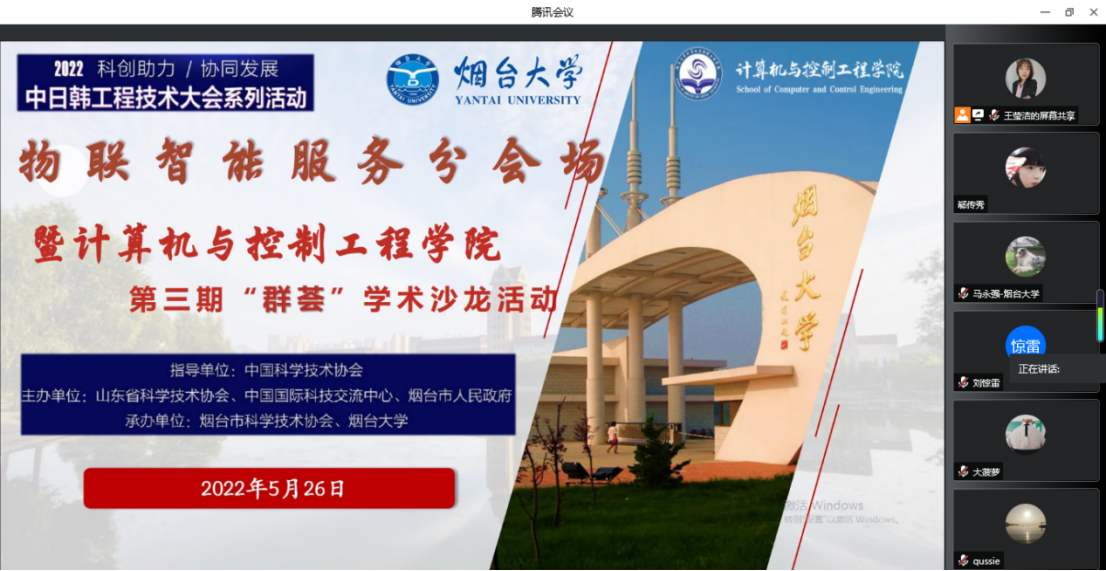 5月26日,2022年中日韩工程技术大会“物联智能服务分会暨烟台大学计算机与控制工程学院第三期‘群荟’学术沙龙活动”通过线上形式成功举办。本次会议由中国科学技术协会指导,中国国际科技交流中心、山东省科学技术协会、烟台市人民政府主办,烟台市科学技术协会、烟台大学科学技术协会承办。会议聚焦物联智能服务领域邀请国内著名专家进行了最新研究成果、创新思想和科学方法的分享,来自全国各地的1000多位专家学者参会。