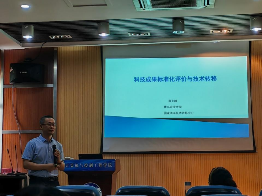 9月5日下午,国家海洋技术转移中心特聘专家、青岛农业大学肖克峰副教授应邀为我院师生作了题为“科技成果标准化评价与技术转移”的学术报告,科技处张立雨、姜滔老师,我院科研骨干和研究生参加报告会,副院长王莹洁主持。