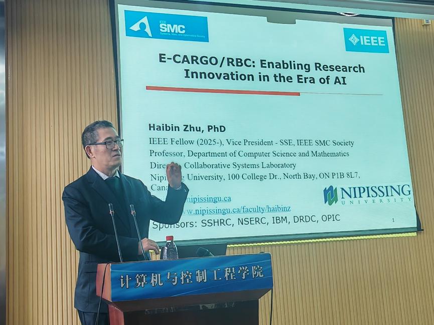 12月26日,加拿大尼普森大学计算机与数学系教授朱海滨博士应邀来校为我院师生作了题为“E-CARGO/RBC: 助力AI时代的创新研究”的学术报告,学院科研骨干教师及研究生代表参加。