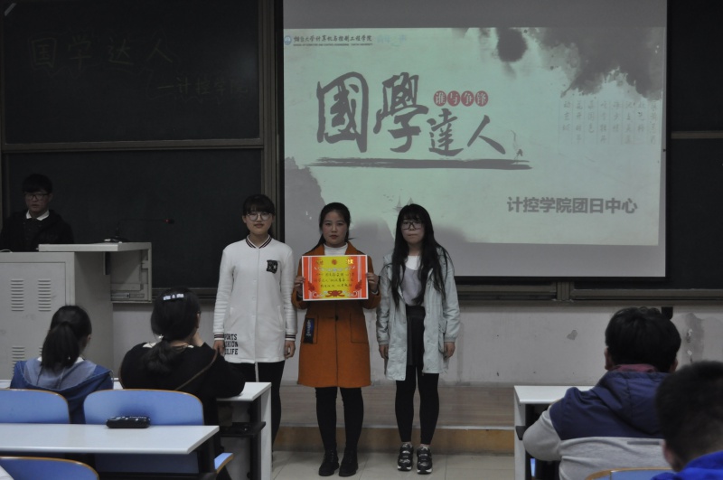 本次“国学达人―知书达礼”挑战赛经过激烈的初赛比拼,共有六个团支部脱颖而出,进入此次决赛。决赛主要考查对中华传统文化的了解,以知识性、趣味性、灵活性的形式,将历史典故与文化经典进行结合,考查形式以选择和填空题型为主,旨在弘扬国学文化之经典。晚七点,决赛正式拉开帷幕。在第一阶段的“知书达礼”回合,六个团支部分成两队,每队分别通过对于20道随机题目的抢答来获取分数,得分最高的三支队伍进入下一回合。在第二回合的较量中,三支队伍针对“四书五经”、“历史文化”、“百家争鸣”三种类型的题目分别作答,并由主考官计时后进行分数累加。裁判团队本着公平公正的原则,统计各项答题分数,在激烈的角逐之后,计153-2班以13分的成绩荣获本次“国学达人―知书达礼”挑战赛第一名,计154-1和计156-2分获得第二名与第三名。