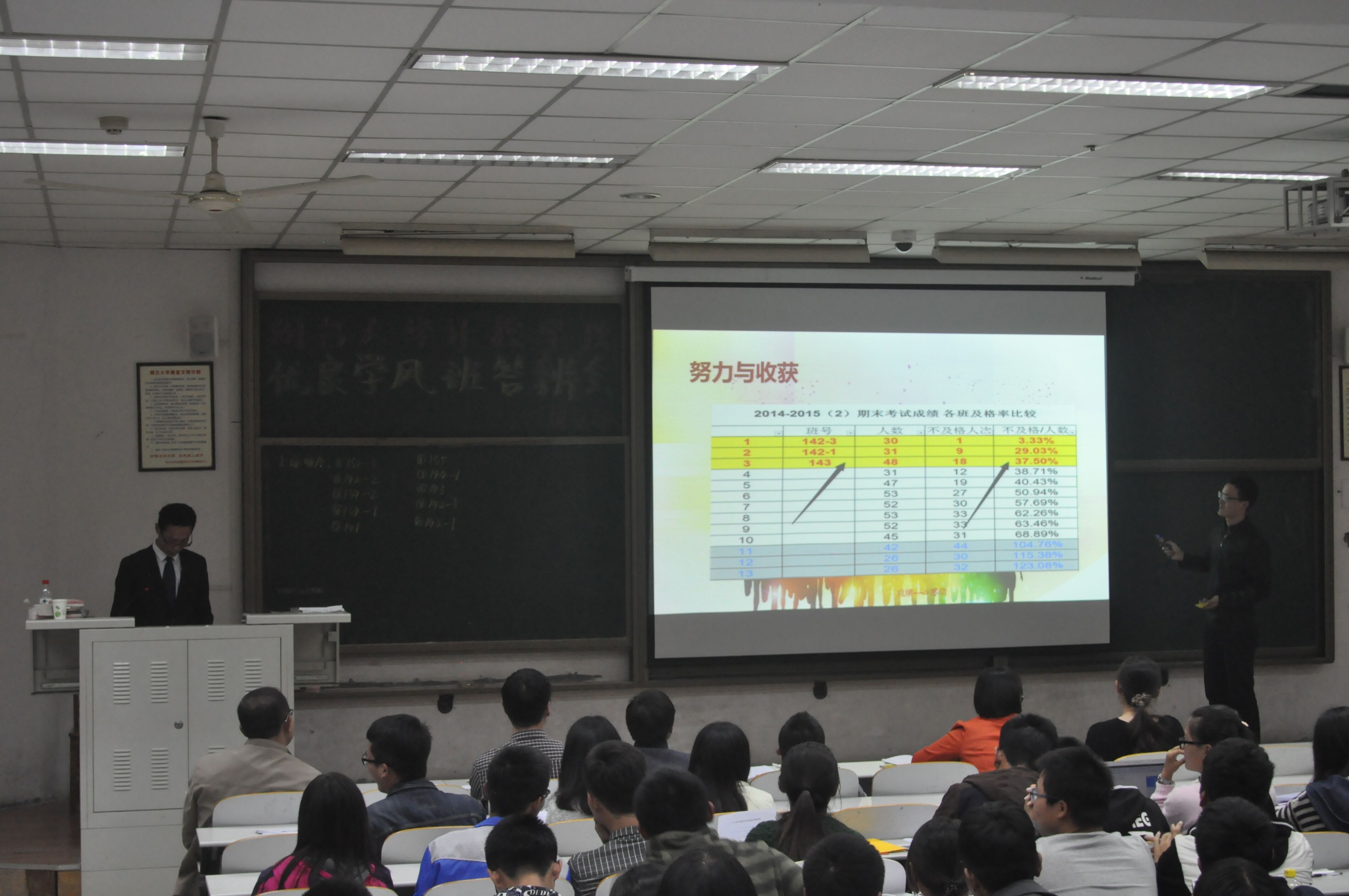在主持人宣布答辩会正式开始后,参加答辩的班级按照抽签顺序依次上台答辩。参加此次答辩的10个参评班级代表以PPT和演讲的形式就班级构成、学风养成、思想建设、文体活动、特色工作等方面做了精彩展示。通过展示与答辩,各班级都将自己的成果和优势充分展现给评委老师及在场观众。优异的成绩、积极的思想、良好的班风、鲜明的特色以及参评班级激情的讲演,不时地引起台下评委及观众的掌声。本次答辩涌现出了学生自主学习帮扶小组、班级全员参加创新创业和社会实践等特色内容。在答辩提问环节中,评委从学风养成、兴趣引导等多方面提出了问题,并结合参评班级的现场表现给予了悉心指导。最后,庞磊老师做了精彩的总结点评,他表示:“更多的同学和班级应该努力去发挥自己的才能,只要每天进步一点点,就会成为看得见的进步。成为优良学风班的班级应该再接再厉,而没有成为的班级应该奋勇前进!”