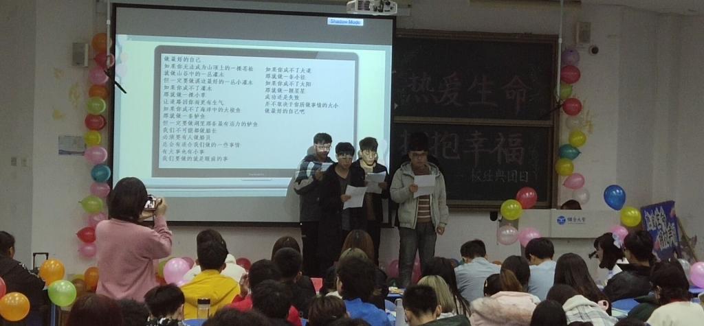 活动伊始,主持人依次介绍本次晚会的嘉宾,并宣布“热爱生命,拥抱幸福”校经典团日总结晚会正式开始。首先,团员们观看了一部微电影——《同心战役,同屏共振》。以微电影的形式向团员们展示了疫情中医护工作的艰难, 团支部成员们也进一步懂得幸福生活来之不易。而后,多人朗诵《做最好的自己》彰显了“热爱生命、拥抱幸福”的主题。随后的路宣汇报活动总结加深了团员们热爱生命、拥抱幸福的认识。总结过后又是一个精彩绝伦的游戏环节——你划我猜。团员们非常活跃,踊跃报名参加。紧接着,歌曲《父亲写的散文诗》,深情地向团员们展现了生命的活力,之后的游戏知识抢答同样使团员们在轻松愉快的氛围里加深了对疫情和新冠病毒的认识。歌曲《春暖花开》充分体现了人们对生命的热爱,对幸福的追求。而在宣传板制作汇报总结中,团员们一起付出的努力在宣传板上栩栩如生。总结后的一首歌曲《我们俩》,使会场里充斥着幸福的气息。随后的收集字画活动汇报总结,以画画这一新形式诠释了疫情当下,生命的意义更显可贵的含义,进一步加深了团员们对于生命意义的理解。接着,相声《追窑》的出色表演,使气氛更加活跃起来。在微电影的播放活动汇报总结中,团员们对热爱生命,拥抱幸福有了更深刻的理解。在歌曲《侧脸》以及主题采访活动的汇报总结的铺垫中,诗朗诵《少年中国说》压轴出场。一首《少年中国说》更加带动了团员们的激情,对当代青少年树立远大理想、担当社会责任具有积极的指导意义。最后嘉宾合影留念,主持人宣布晚会圆满结束。
