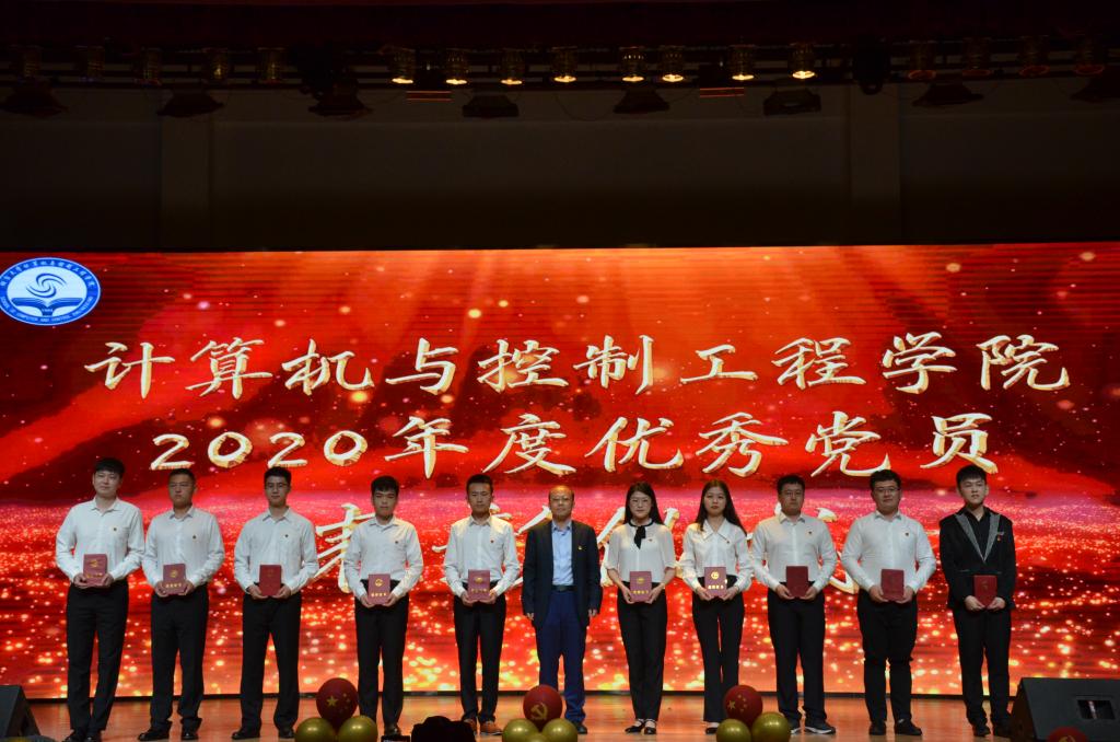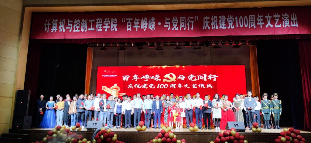 为庆祝中国共产党成立100周年,歌颂党走过的辉煌历程和取得的伟大成就,推动党史学习教育走深走实,表彰优秀党员,5月29日晚,计算机与控制工程学院在弘毅厅举办“百年峥嵘,与党同行”庆祝建党100周年文艺演出。院党总支书记秦月红、院长童向荣、副院长张楠、副处级组织员丁晓丹、院长助理王莹洁、马文明,以及学院各党支部党员代表、团员青年代表共同参加活动。