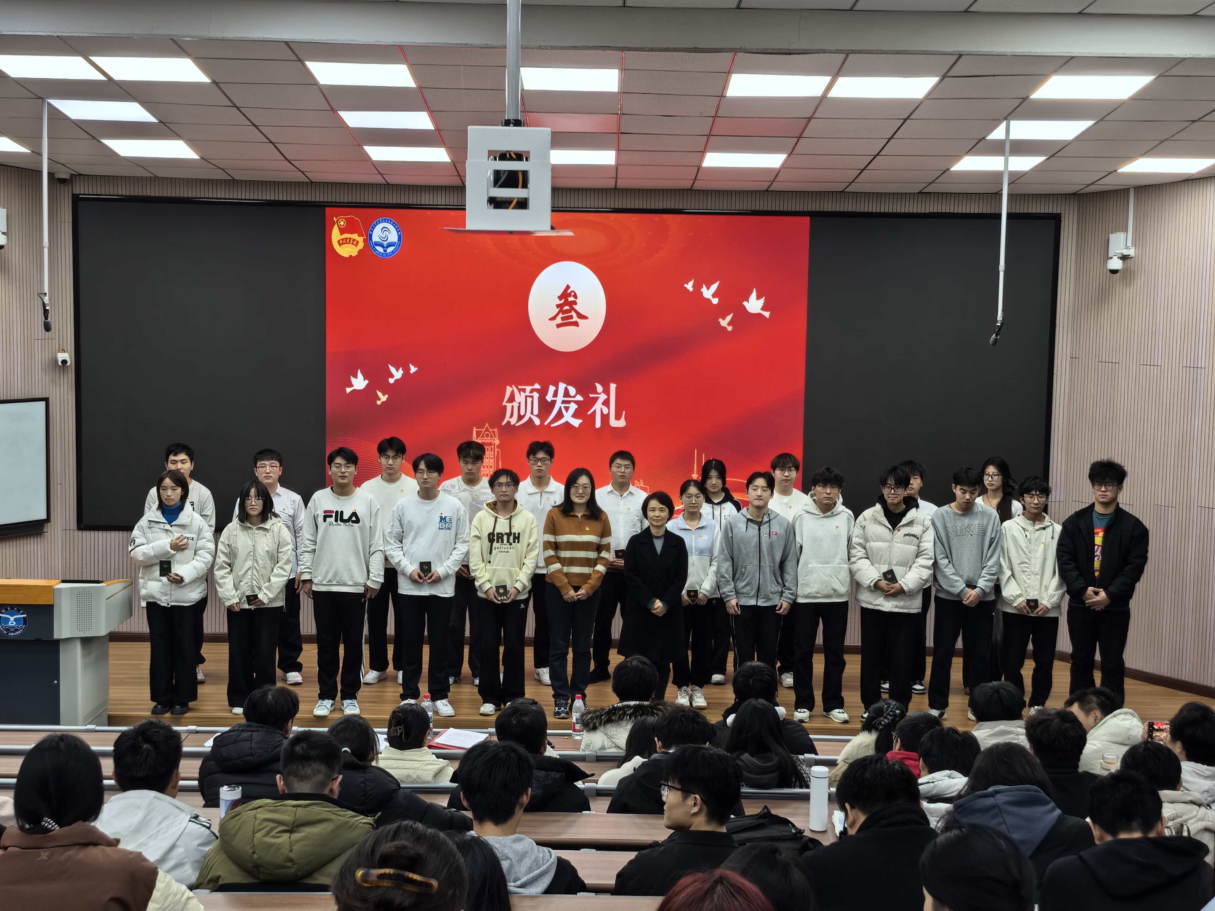 王颖、苏倩一同为新发展团员颁发团员证并佩戴团徽。新团员胸前的团徽在灯光下熠熠生辉,既象征着共青团的使命担当,也点亮了他们践行青春理想的信念之火。